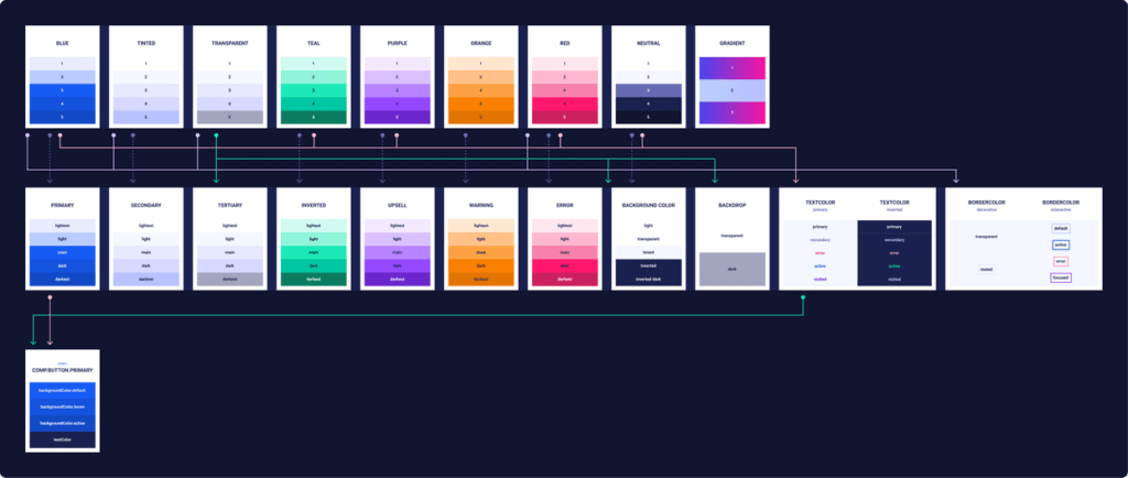 It was then time to begin work on the ‘semantic’ tier tokens. These are tokens with contextual meaning that link to context-less ‘global’ tokens. Semantic style examples include text color, typography styles, icon sizes, and interaction palettes. These styles are then combined in many different ways to make the final tier, ‘comp’.