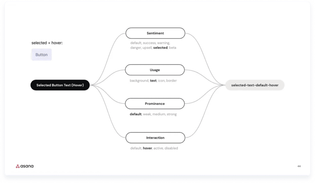 With the tiers in place, it was finally time to think about token name structure. What should we include in a design token name, and in what order? This well-known, oft-referenced talk by the Asana team on Schema 2021 served as a great starting point. The whole video is worth a watch, but of special interest is the hierarchical naming convention the Asana team uses to name design tokens.