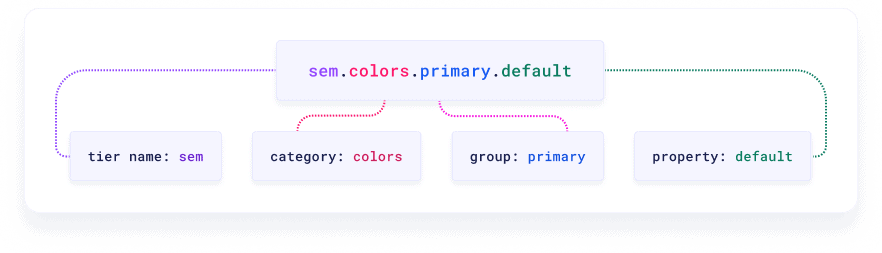 - A token name is composed of the following semantic attributes: tier.category.property.state